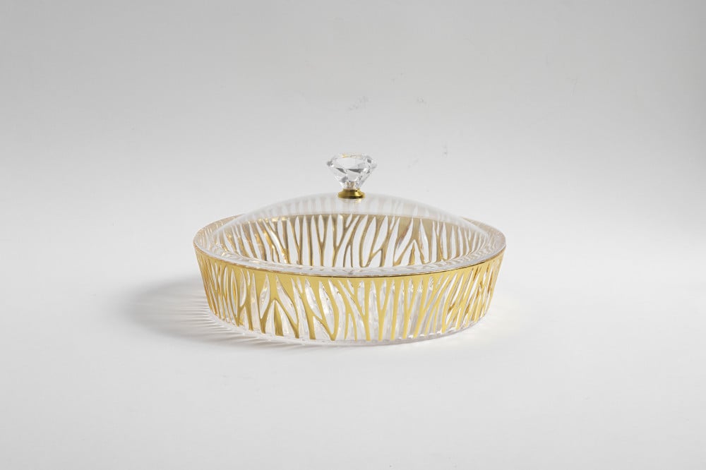صينية أكرلك دائرية بغطاء وبنقشة ذهبية مموجه