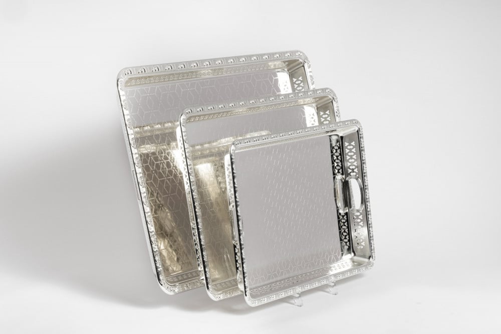 طقم تبسي مستطيل فضي 3 قطع - وصف تفصيليالمجموعة: طقم تبسي أنيق من 3 قطع مستطيلة الشكل باللون الفضي اللامع.مميزات عامة:تصميم عصري أنيق يناسب جميع الديكوراتألوان فضية لامعة تضيف لمسة جماليةتصنيع عال...