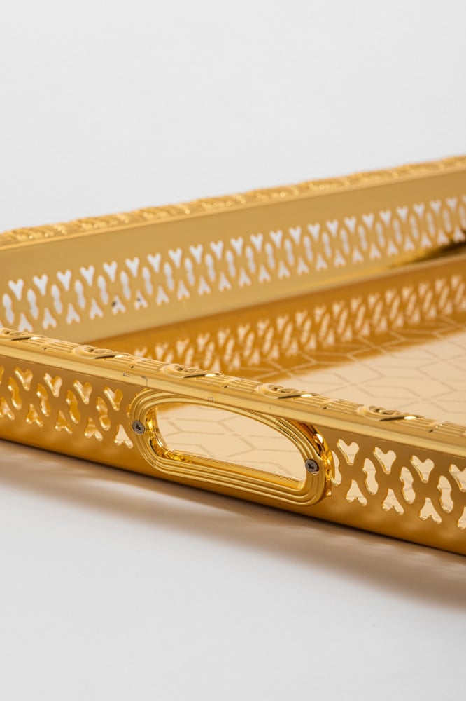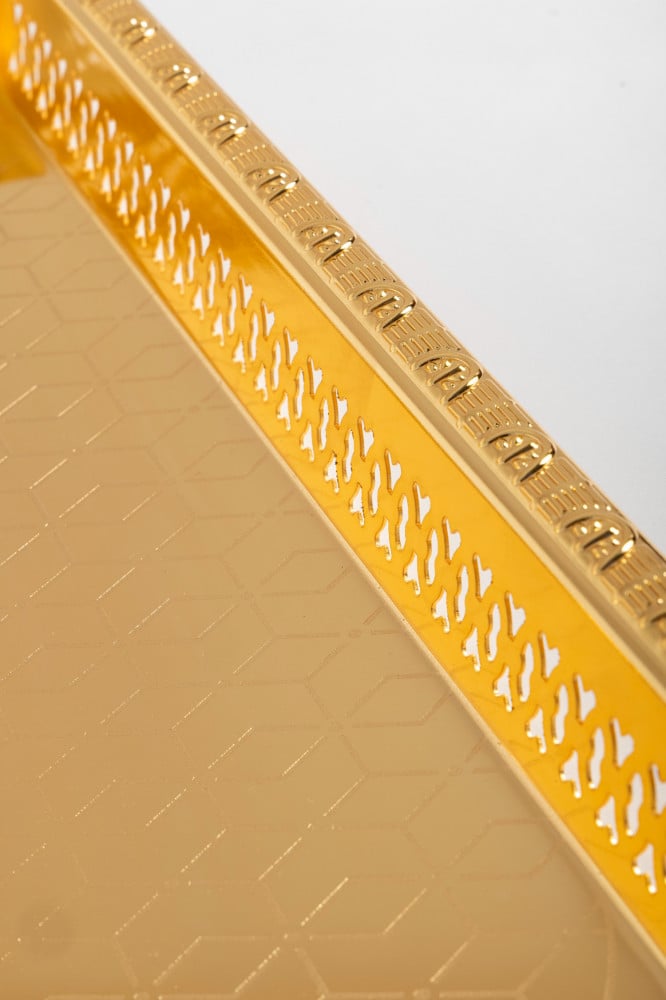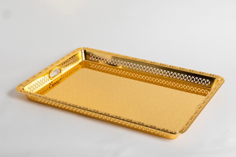 تُعد مجموعة التبسي الذهبية المستطيلة إضافة أنيقة وعملية لطاولة الضيافة، حيث تتكون من ثلاث قطع متناسقة متفاوتة الأحجام (كبير، وسط، صغير)، مصممة بدقة لتلائم احتياجات التقديم بأناقة.المواصفات الفنية للقط...