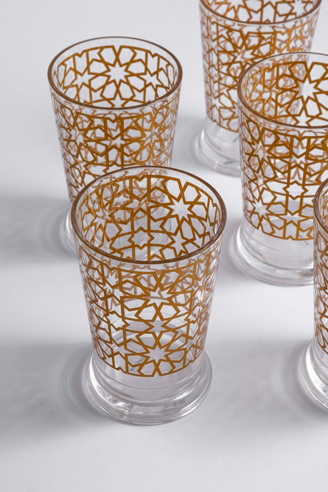 طقم الكاسات هي مجموعة مثالية وفاخرة جداً وأنيق تناسب جميع المناسبات لما لها من اطلالة وبريق اثناء تقديمها لضيوفك مصنوعة من أجود أنواع الاكرلك تستخدم في تقديم المشروبات الباردة بمختلف أنواعها كما أن الطقم مكون من 6 قطع تتميز بأنها مزخرفة بشكل دائري عليها بزخرفات متنوعة باللون ذهبي داكن مميز وتصميم عصري ما يجعله مميزة وأيضاً يتميز بسهولة التنظيف ويتمتع بمتانة ممتازة هذا ما يجعله اختيار الكثيرين كما يتمين شكل الكاسات بشكل دائري مميز .
