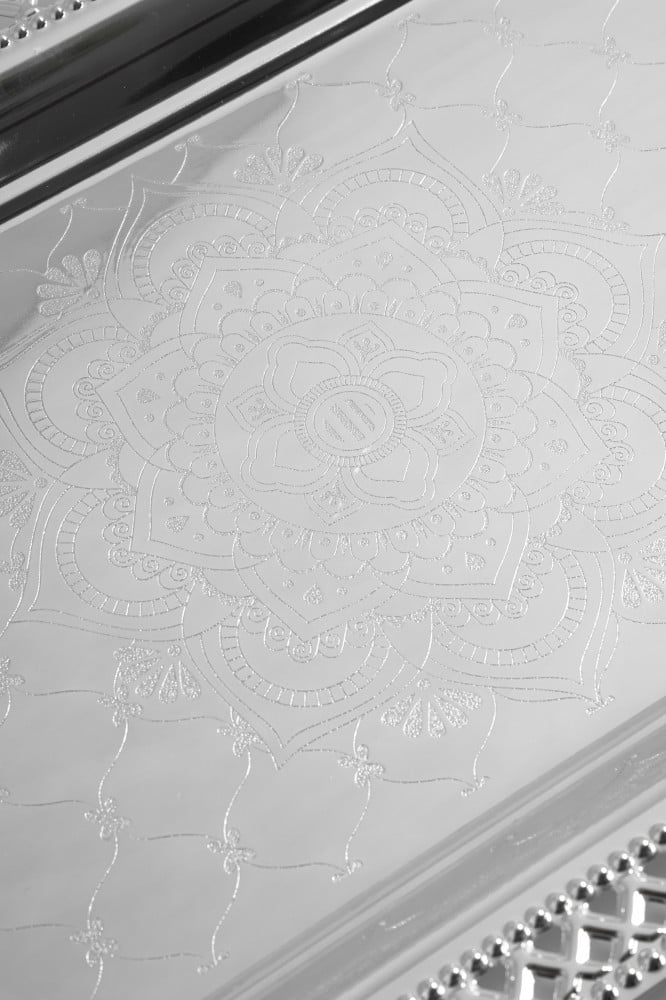 مصنوع بعناية فائقة من معدن فضي لامع يمنحك مظهرًا أنيقًا وجذابًا، وتزينه أطراف ومقابض ذهبية فاخرة تضيف لمسة من التميز والترف لأي مناسبة.