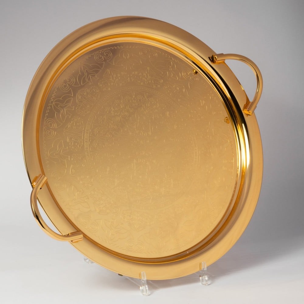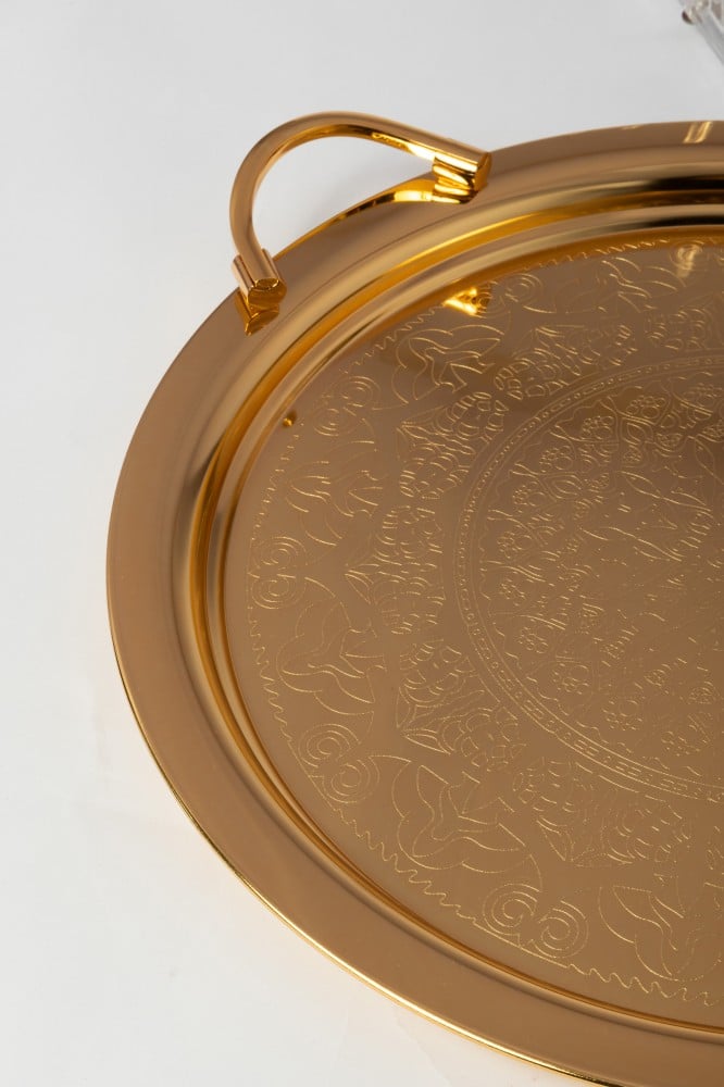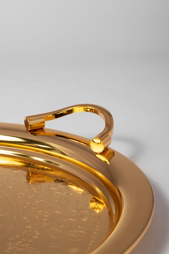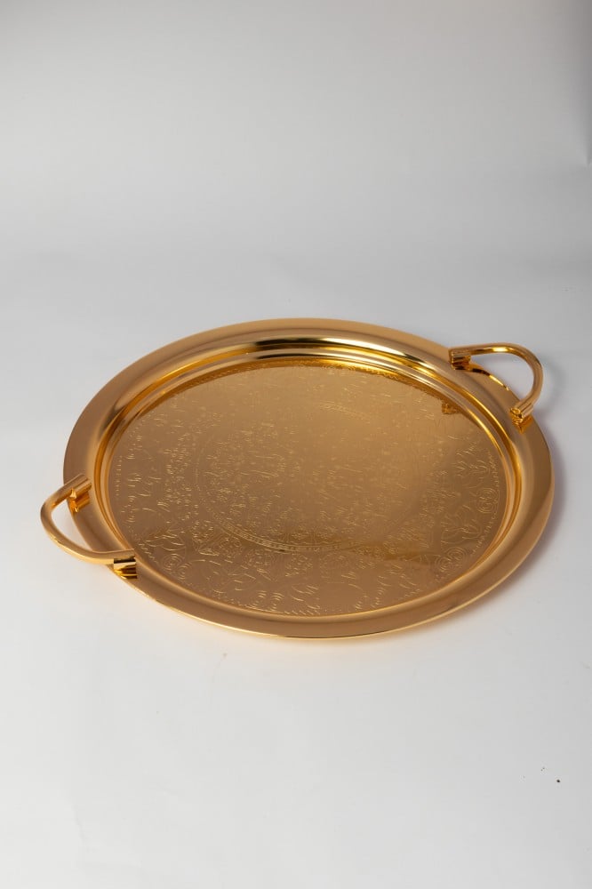 لو كنتِ تبحثين عن لمسة فاخرة تضيفينها لضيافتك، هذا التبسي الدائري الذهبي هو الخيار الأمثل! بقطر 40 سم، يوفر لك مساحة واسعة لتقديم الحلويات والمقبلات بشكل أنيق يليق بكل مناسبة. لونه الذهبي اللامع ومقابضه الذهبية تضيف لمسة من الفخامة والتميز على طاولتك، مما يخليه قطعة لا غنى عنها في كل مناسبة.